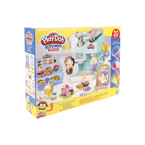 Игровой набор от Play-Doh предназначен для детей старше 3 лет. В яркой коробке ребенок найдет игрушечную кофемашину, 8 банок с пластичной массой для лепки, 20 полезных аксессуаров. С таким оснащением можно устроить веселую игру, включив фантазию на полную мощность.