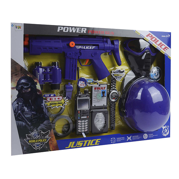Игровой набор «Police» со световыми и звуковыми эффектами и каской — увлекательный комплект для детей от 3 лет, позволяющий вжиться в роль полицейского. В набор входят имитация пистолета с подсветкой и звуком, каска, рация, наручники, часы, бинокль и другие аксессуары, которые напоминают настоящие полицейские атрибуты.