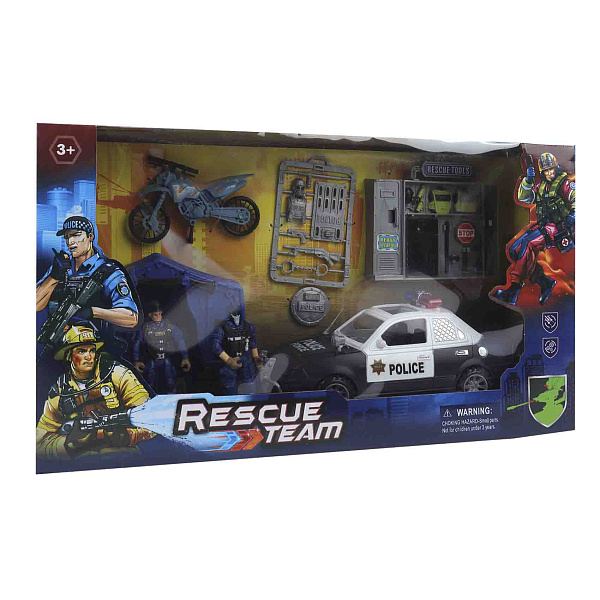 - Содержимое: 2 фигурки полицейских, 1 полицейская машина, 1 мотоцикл, 1 контейнер с инвентарем, 1 палатка-штаб, аксессуары серого цвета