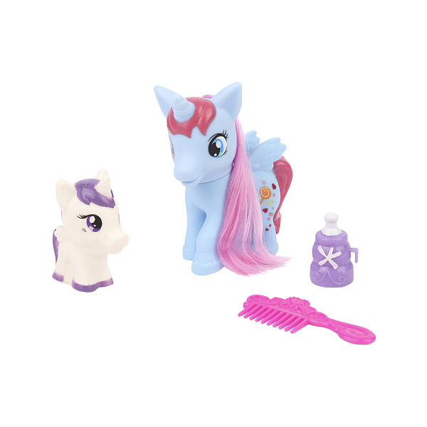 Детский игровой набор «Сказочный пони с малышом и аксессуарами». Он состоит из двух миниатюрных волшебных лошадок: мамы с длинной мягкой розовой гривой и жеребенка. В комплекте с ними расческа и бутылочка для кормления. У игрушек большие добрые глаза и маленькие крылья на спине. Положение их головы можно менять в процессе игры.