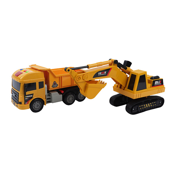 Игровой набор включает самосвал и экскаватор, выполненные в масштабе 1:16. Машинки выполнены в ярко-желтом цвете с черными и серыми деталями, что создает реалистичный внешний вид. Самосвал оснащен поднимающимся кузовом, а экскаватор имеет поворотную стрелу с ковшом, который можно поднимать и опускать. Набор работает от батареек, имеет световые и звуковые эффекты, имитирующие работу строительной техники.