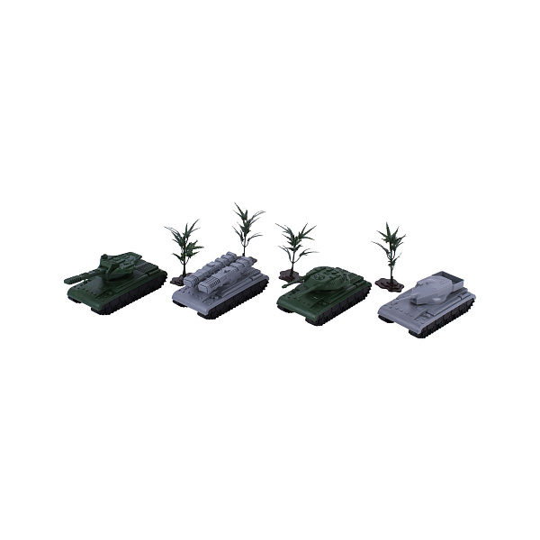 Детский игровой набор «Союзники» с военной техникой. В комплекте – 8 элементов: 4 танка и 4 декоративных куста. Каждый игрушечный танк повторяет реально существующие модели. На их корпусах много деталей, добавляющих игрушкам реализма. Искусственные растения крепятся на специальные устойчивые подставки.