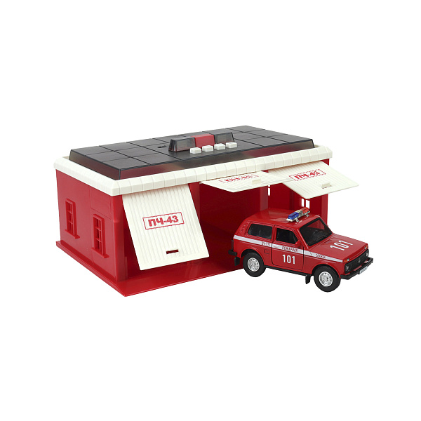 Порадовать каждого маленького автолюбителя сможет игровой набор «Пожарная часть». В него входит конструкция из гаражных боксов с поднимающимися воротами и автомобиль с механизмом инерционного типа. Внеси разнообразие в сюжет помогут световые и звуковые эффекты. Для их включения на крыше постройки имеются кнопки. Игра надолго займет внимание ребенка, положительно повлияет на его воображение. Манипуляции с игрушками стимулируют моторику рук, улучшают координацию движений, дарят позитивные эмоции.