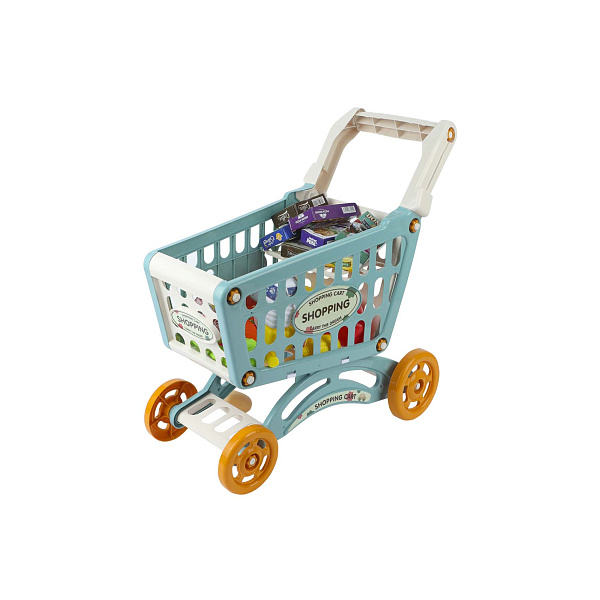 Игрушечная тележка оснащена ручкой, удобной для захвата детскими ручками, полочкой, куда можно поставить сумочку или игрушку. Пластиковые колеса позволят возить изделие по разных поверхностям, расширяя пространство игры. Комплект включает 56 предметов для игры: пластиковые овощи и фрукты, баночки, консервы, картонные коробки круп и т.д. Все они помещаются во вместительную корзину тележки.