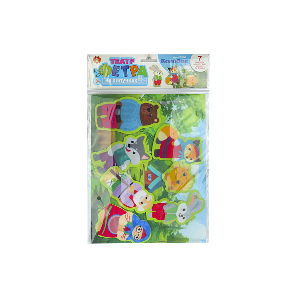 Игровой набор в виде красочных фигур позволит ребенку устроить настоящее театральное представление или веселую игру. Персонажи из сказки «Колобок» надолго займут внимание детей, отвлекут их от гаджетов. Игрушки фиксируются на основе с помощью липучки, перемещаются одним движением.
