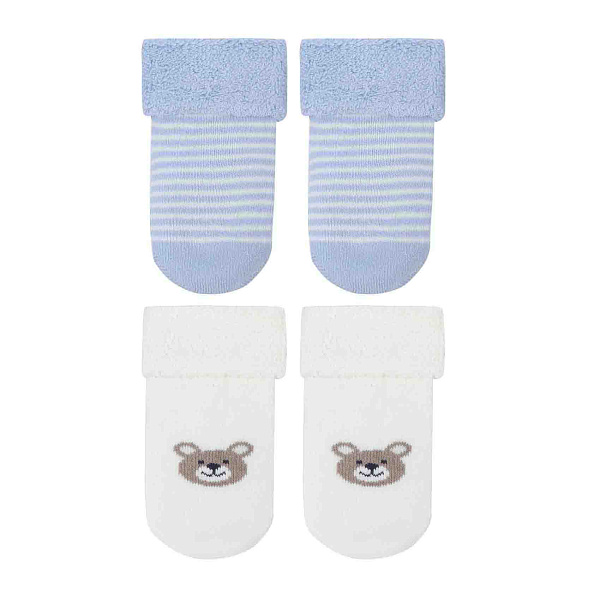 Комплект включает две пары носков с разным дизайном: одна пара в нежных голубых полосках, другая — белая с милым изображением медвежонка. Мягкие отвороты обеспечивают надежную посадку и дополнительное тепло вокруг щиколотки.