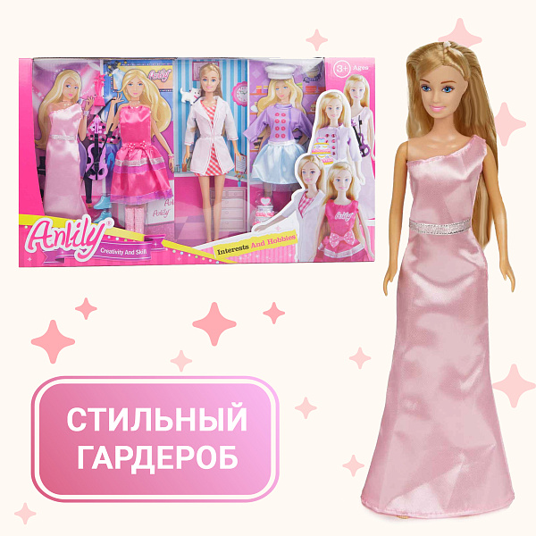 Игровой набор с куклой Anlily Хоббивключает в себя четыре разнообразных образа для различных сюжетно-ролевых игр.В комплект входит: стильный образ ветеринара с маленькой кошечкой, образ шеф-повара с головным убором-колпачком и двухэтажным праздничным тортом, вечерний образ для ковровой дорожки со статуэткой-премией, а также образ для музыкального концерта с красивым платьем и скрипкой. Каждая малышка будет рада получить такой большой набор, чтобы весело и разнообразно проводить время со своей куколкой!