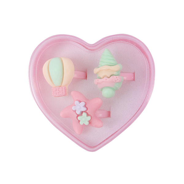 Набор оригинальных матовых детских колечек из пластика порадуют юных модниц. В комплекте три украшения в пастельных тонах с объемными декоративными элементами в виде воздушного шара, морской звезды и мороженного. Они легко надеваются и снимаются. Будут отлично сочетаться с легкими летними нарядами.