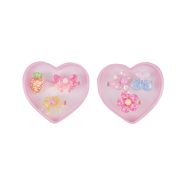 Яркий и блестящий набор детских глиттерных колечек. Украшения выполнены из пластика. Классические кольца дополнены объемными элементами в виде цветов и ягод с разноцветными блестками внутри. Размер изделий регулируется. Они легко надеваются и снимаются. Не доставляют дискомфорт во время носки.