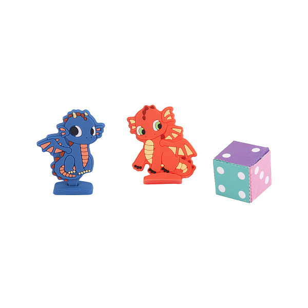 В наборе: игровое поле, изготовленное из бумаги, небольшой кубик, который нужно собрать своими руками, а также две фишки в виде фигурок забавных дракошек, изготовленные из полимерных материалов.