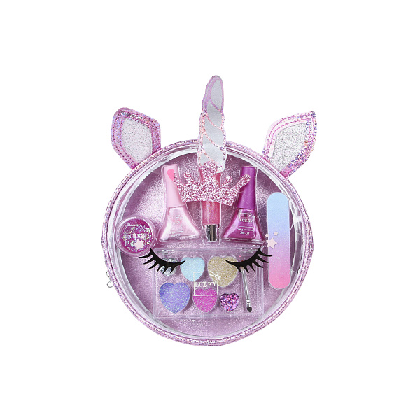 Набор в круглой косметичке «Единорог» поможет маленькой девочке сделать себе такой же красивый макияж, как у мамы. В наборе для этого есть все необходимое. Тени для век с блестками, которые легко наносятся входящим в комплект аппликатором, а смываются с нежной детской кожи обычной водой. Ягодный полупрозрачный блеск для губ имеет приятный аромат спелой малины. Пилочка помогает поддерживать красоту ногтей, а лаки делают их более яркими и заметными. Сверкающие блестки для лица и тела на гелевой основе пригодятся для создания праздничного образа. Всю косметику можно сложить внутрь косметички в виде мордочки милого единорога и взять с собой.