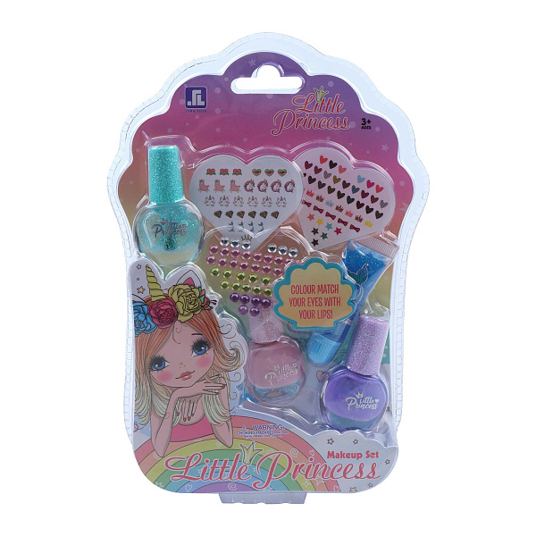 - В комплекте: 3 лака для ногтей, 1 блеск для губ, 3 листа наклеек, набор страз