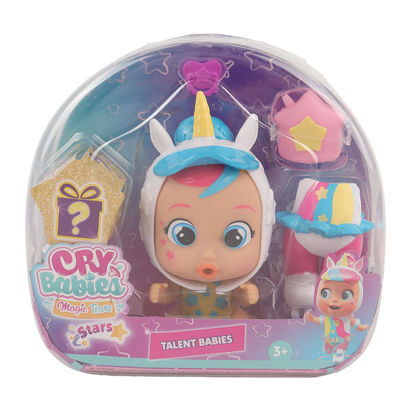 Кукла из серии «Cry Babies: Шоу талантов» зовет подружек на новые приключения. В эту серию входят 8 ярких куколок размером 12 см, каждая из которых обладает уникальным талантом и готова его продемонстрировать. В комплект входит роскошный костюмчик для выступления, аксессуары и пустышка.