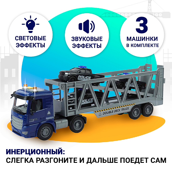 По встроенному трапу на прицеп загружаются три полицейские машины, входящие в комплект. Игрушка двигается с помощью инерционного механизма, который не требует наличия батареек. С такой игрушкой каждый ребенок сможет представить себя водителем мощной машины, перевозящей полицейские автомобили к новому месту службы.