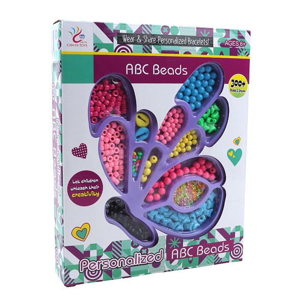 Набор для создания украшений из бусин имеет упаковку в форме бабочки. Упаковка фиолетовая с зелеными и желтыми акцентами. Внутри размещены бусины разных цветов и форм: круглые, ракушки, цилиндры, бантики. Также в набор входит веревочка. Дети нанизывают бусины на веревочку, создают браслеты, ожерелья и другие украшения. Можно сделать именные украшения из бусин с буквами.