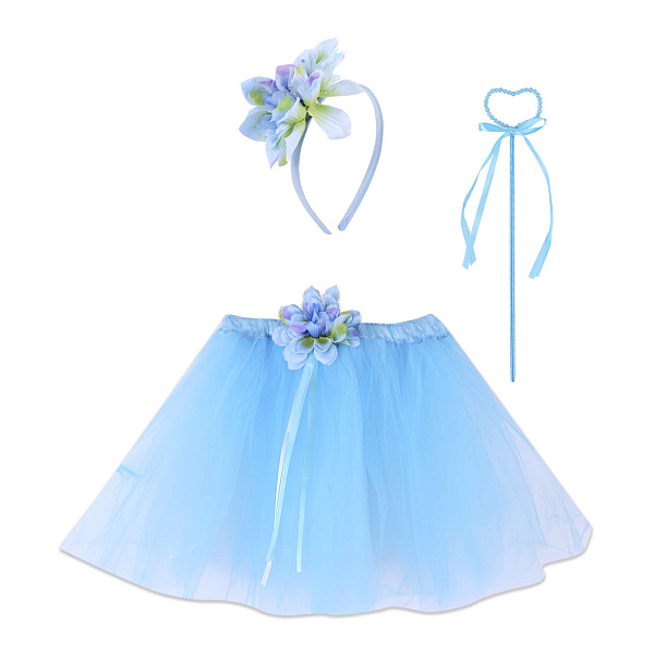 Набор «Карнавал» – идеальный выбор для создания волшебного образа на любой праздник или тематическое мероприятие. В комплект входят юбка, ободок и волшебная палочка, оформленные в нежных голубых тонах.