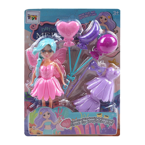Набор «Кукла Фея» включает куклу высотой 15 см с яркой прической и съемными платьями из пластика. В комплект входят три наряда, а также набор аксессуаров: три воздушных шарика и маска с ручкой. На спине у куклы расположены крылья.