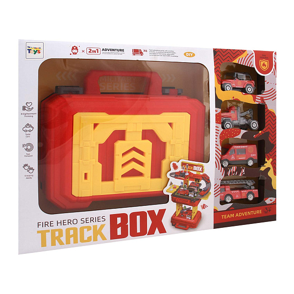 Игровой набор «Track box» состоит из двухэтажного трека со спиральным спуском, шести машинок и набора дорожных знаков. Машинки выполнены в стилистике спецтехники, что добавляет разнообразия в игровые сценарии и развивает воображение. Дорожные знаки учат основам правил на дороге в игровой форме. Игра с машинками тренирует координацию и фантазию. Компактный кейс помогает держать игрушки в одном месте и сохранять порядок в детской комнате.
