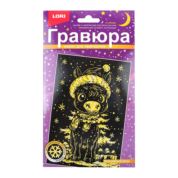 Набор для творчества «гравюра малая. Волшебный пони» — художественный набор для детей от 6 лет, который позволяет самостоятельно создать яркое и выразительное изображение пони с помощью техники гравировки. В основе набора — основа с нанесённым контуром рисунка с металлизированным слоем, который проявляется при аккуратном снятии верхнего слоя с помощью специального инструмента — штихеля.
