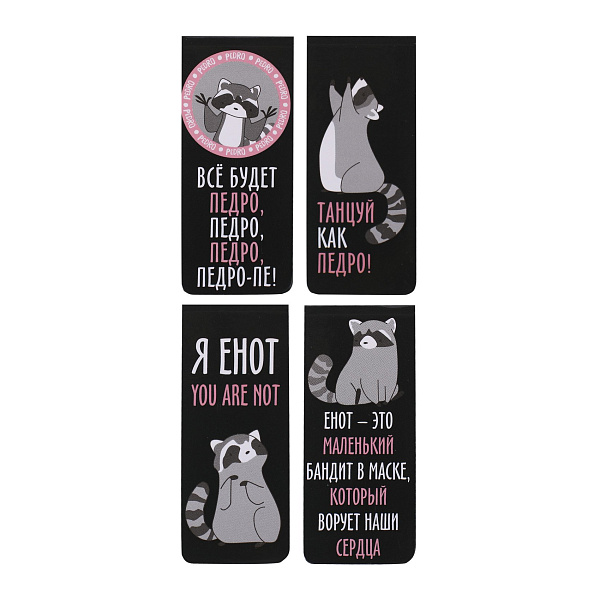 Набор магнитных закладок «Pedro Raccoon» — это идеальное сочетание функциональности и стиля для современных книголюбов. Этот набор состоит из четырех уникальных закладок, украшенных забавными изображениями енота Педро и вдохновляющими надписями.