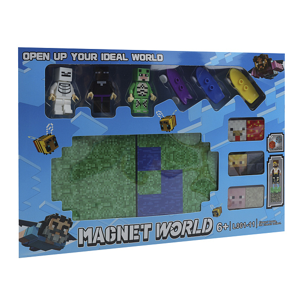 Набор магнитный «Magnet World: Схватка в верхнем мире» от Lanson Toys — увлекательный игровой комплект для детей от 6 лет, посвящённый приключениям в пиксельном мире. Включает трёх персонажей — зелёного крипера, белого скелета и чёрного эндермена — а также оружие (меч, топор, лук), блоки ландшафта (трава, вода) и элементы декора.