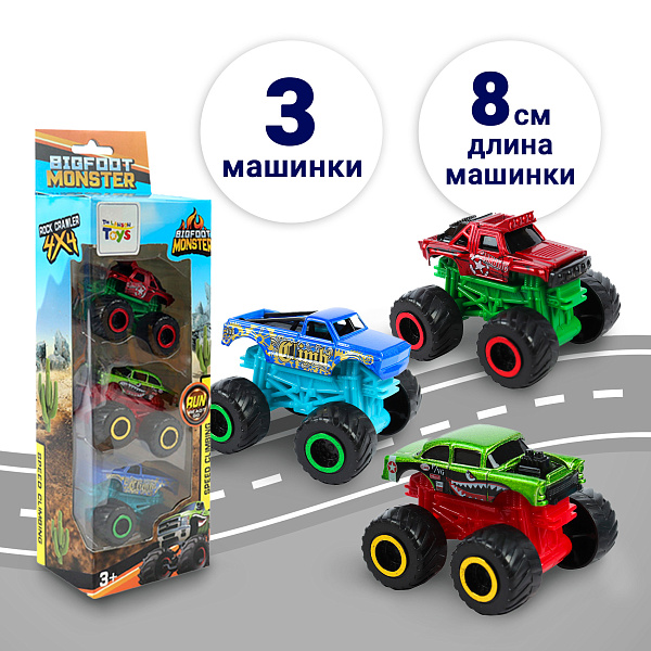 Хорошим презентом для юного любителя техники станет набор из трех автомобилей на огромных колесах. Они привлекают внимание нестандартным внешним видом и ярким дизайном кузова, способны успешно преодолеть различные препятствия на своем пути.