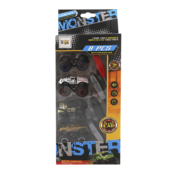 Набор из четырёх внедорожников выделяется ярким и запоминающимся дизайном каждой модели. Все машинки стилизованы под мощные монстр-траки с крупными колёсами и прочными кузовами. В комплекте есть пусковые устройства, которые позволяют легко запускать машинки и устраивать настоящие гонки и соревнования.