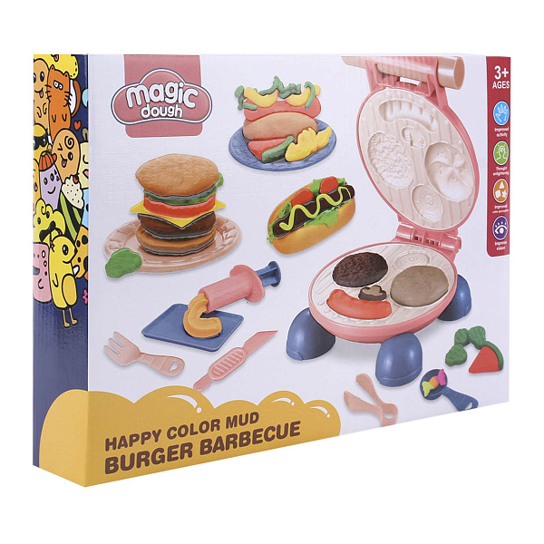 В комплект входят игрушечная барбекю-печь с формами и инструменты для лепки (тарелки, вилка, ложка и так далее), с помощью которых легко создать бургеры, хот-доги, и другие блюда на гриле. Пластичная масса приятно ощущается в руках и безопасна для детей.