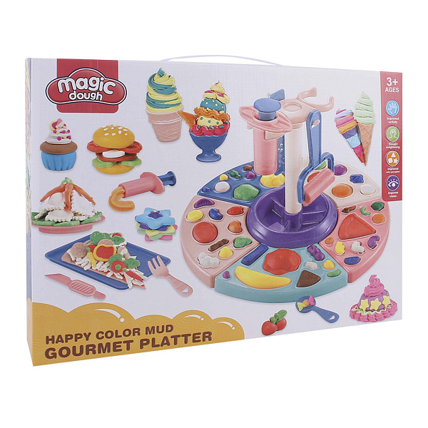 Конструкция набора включает удобную платформу в виде вращающейся подставки, на которой расположены многофункциональные секции для лепки. В комплект входят различные формочки в виде еды и аксессуары для «готовки». Все элементы изготовлены из прочного и безопасного пластика. С таким набором ребенок слепит из цветной массы свои любимые блюда, проявив фантазию и аккуратность – бургеры, мороженое, фрукты или тортики.