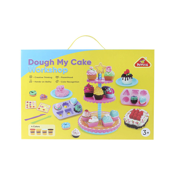 Комплект упакован в красивую подарочную коробку. В его состав входит четыре баночки с цветной пластической массой, формы для изготовления капкейков, тарелочки, инструменты для выравнивания поверхности изделий, а также круглый стеллаж для выкладки готовой «продукции».