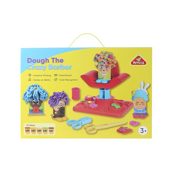 В состав комплекта входит 5 баночек с особой массой для лепки красного, желтого, черного, зеленого и белого цветов. Также в комплекте имеются формы и предметы для изготовления причесок, шаблоны фигурок клиентов парикмахерской. В эту увлекательную игру можно играть бесконечно, придумывая все новые варианты причесок.