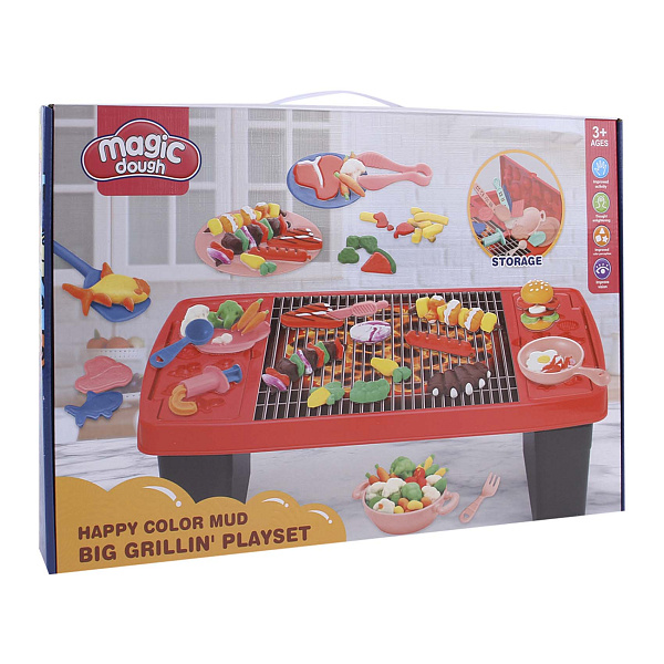 Стол для гриля выполнен в виде прочной поверхности с имитацией огня и решетки для приготовления еды. Он оснащен многофункциональными аксессуарами, такими как щипцы, тарелки и формочки, позволяющими лепить реалистичные блюда. Все аксессуары удобно хранить в ящиках по бокам стола.