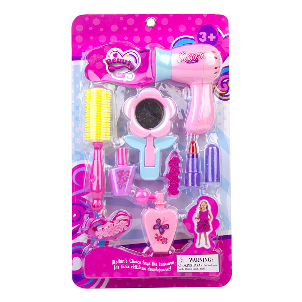 Тут есть фен и настоящая расческа, чтобы уложить волосы в красивую прическу, лак для ногтей, две заколки и губная помада, а напоследок — флакончики духов с распылителем. Чтобы оценить созданный образ, нужно зеркало - оно в красивой подставке в форме цветка. Набора изготовлен в любимом для девочек цвете – розовом, в сочетании с малиновыми и мятными деталями для модного дизайна.