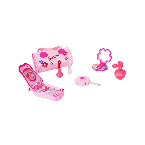 Набор модных розовых аксессуаров для юной красавицы упакован в модную сумку с цветочками и застежкой типа молния. Внутри сумочки находится 5 игровых предметов: раскладной мобильный телефон с серебряными кнопками, флакончик духов, помада, набор цветных теней в форме крыльев бабочки, упакованный в коробочку с зеркальцем, и ключ от автомобиля с головкой виде цветка.
