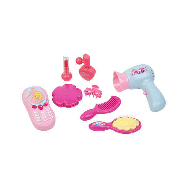 В состав набора входят игрушечные аксессуары: косметичка, зеркальце, две расчески, фен, флакончик духов, телефон, заколка. Упаковка и аксессуары окрашены в розовый цвет. Этот набор поможет девочке сделать свою куклу современной леди. Детали набора легко очищаются от загрязнений, они прочны и гигиеничны. Таким набором родители наверняка обрадуют свою маленькую дочь. Рекомендовано для детей старше 3 лет.