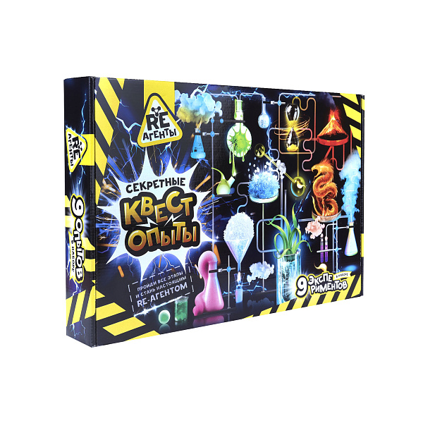 Секретные квест-опыты сделают из ребенка самого настоящего агента и ученого. В большой красочной коробке юный химик найдет элементы для 9 познавательных экспериментов: извержение вулкана, искуственный снег, химические водоросли, пышная пена, скалистый риф, дым из бутылки, глазастая слизь, песок с необычными свойствами и фараонова змея. Чтобы опыты сработали, их нужно провести в определенном порядке, следуя инструкции. Только истиный Re-агент сможет пройти все эксперименты и стать настоящим ученым. В процессе игры развивается усидчивость, моторика рук, логическое мышление и умение работать с химическими веществами.