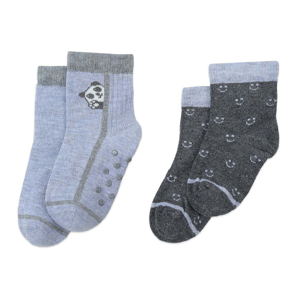 Две пары носков для мальчика представлены в спокойных голубом и сером цветах с милыми узорами — голубые носочки украшены маленькими смайликами, а серые дополнены голубой полоской и рисунком с пандой, на стопе имеется антискользящее точечное покрытие. Такие носки станут отличным дополнением к повседневному гардеробу, гармонично сочетаясь с разной одеждой, создавая комфортный образ для ребёнка.