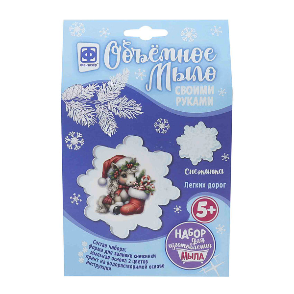 Набор для творчества «объёмное мыло» — привлекательный набор для детей от 5 лет, позволяющий создать праздничное объёмное мыло с ярким новогодним рисунком милой лошадки в шапочке санты и рождественским носком с подарками. В набор входят мыльная основа двух видов (прозрачная и белая), пластиковая форма для заливки, картинка на водорастворимой бумаге и подробная инструкция.