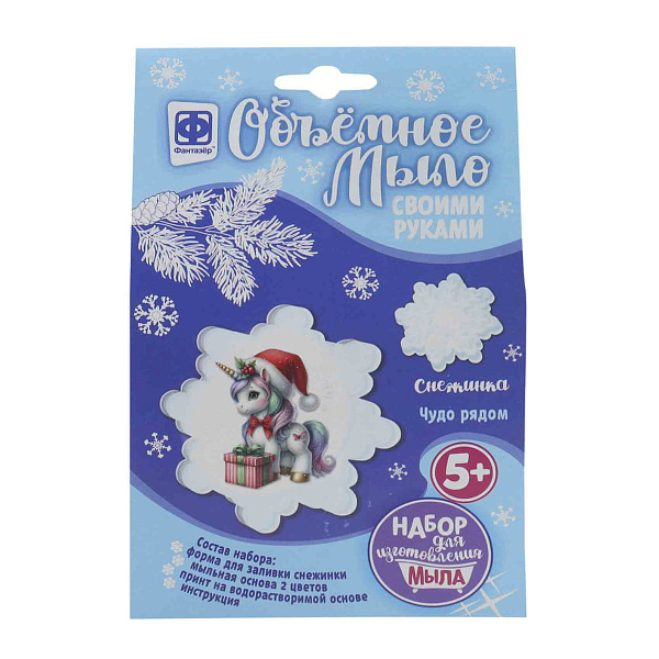 Набор для творчества «объёмное мыло своими руками» — увлекательный набор, предназначенный для детей от 5 лет, который позволяет создать красивое объёмное мыло в форме снежинки с изображением праздничного единорога. В набор входят мыльная основа двух цветов, прозрачная форма для заливки мыла с рисунком снежинки, водорастворимый принт с изображением единорога в новогодней шапочке и подробная инструкция.