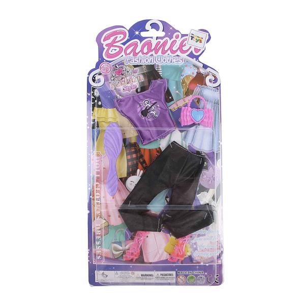 Набор одежды и обуви для модельной куклы дополнит гардероб любимой подружки и сделает игры еще интереснее. В ассортименте представлены джинсы или яркая юбкя, футболку с оригинальным принтом, пару обуви, а также аксессуары.