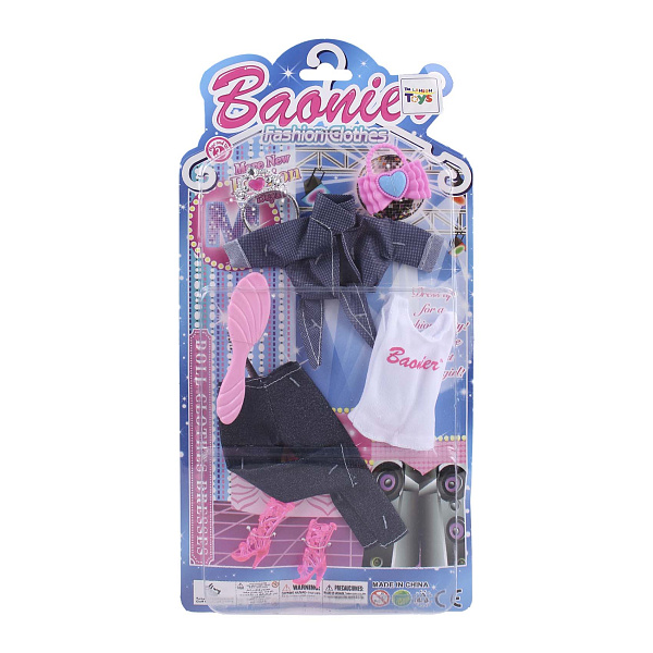 Набор одежды и обуви для модельной куклы идеально дополнит коллекцию стильных аксессуаров. Комплект включает в себя стильный комплект одежды, яркие туфли и расческу. Дополняет наряд серебристая диадема. Завершают стильный ансамбль яркая розовая сумка с голубым сердечком.