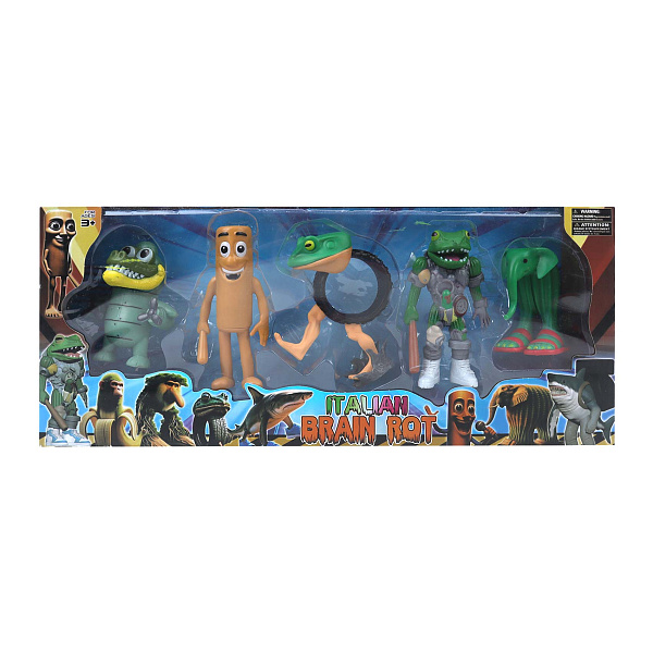 Игровой набор «Итальянский брейнрот» включает пять фигурок. Некоторые элементы можно менять местами. Фигурки стоят устойчиво на ровной поверхности.