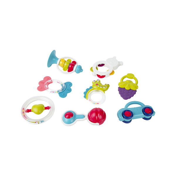 Набор погремушек состоит из 8 предметов разнообразной формы и функциональности. Так как это первые игрушки в жизни малыша, каждая модель отличается обилием красок, а также имеет специальные вращающиеся детали. Игра с погремушками надолго увлечет ребенка, поможет освоить хватательный навык, развивает слух, зрение, тактильное восприятие, координацию и пространственное мышление. Материал изготовления - прочный ABS-пластик (не крошится, не ломается). В его составе нет бисфенола. Импровизированные животные, фрукты, кольца, шар, автомобиль и дудочка привлекут внимание ребенка причудливой формой. Рекомендуемый возраст - с первых дней жизни.