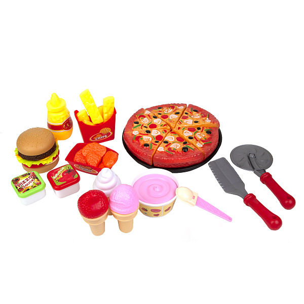 Оригинальный комплект помещен производителем в удобный пластиковый бокс. В набор входит порционная пицца, картофель фри, гамбургеры, соусы и мороженное.