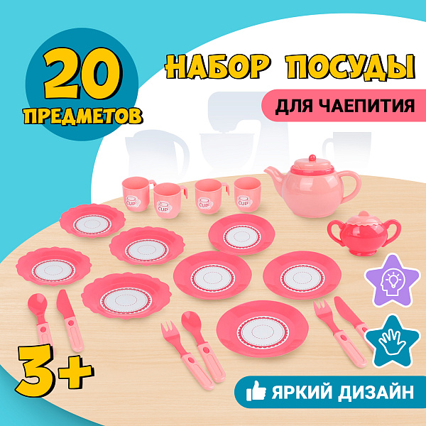 Игровой набор посуды для сервировки стола предназначен для детей от 3 лет, которые любят весело проводить время за сюжетно-ролевыми играми. Набор выполнен в нежных розовых и белых тонах. В комплекте найдутся тарелки, чашки, вилки, ножи и ложки, что идеально подходит для игры с друзьями или куклами. Также в наборе есть чайник, сахарница и молочник, что позволяет разыгрывать сцены чаепития и сервировки стола.