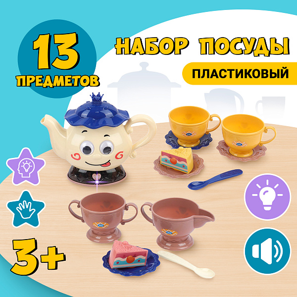 Оригинальный игровой набор посуды для чаепития «Мультяшные образы» со звуковыми и световыми эффектами. В комплект входят две чашки, сахарница, молочник, четыре блюдца, две ложечки, чайник и игрушечные пирожные. Все изделия изготовлены из яркого и прочного пластика и украшены декоративными наклейками.