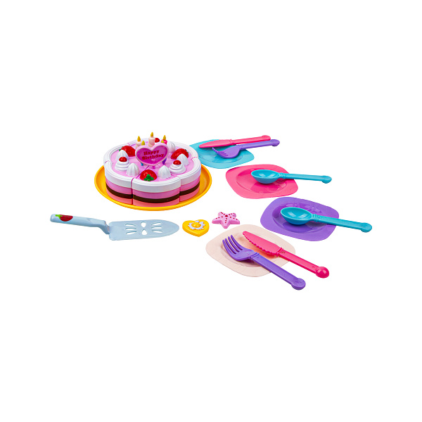 Устроить веселое чаепитие ребенок сможет с оригинальным игровым набором. В комплектацию входит торт, порезанный на порции, лопатка, тарелки, нож, ложки, вилки, свечи, декор для украшения стола. Игрушка предназначена для девочек старше 3 лет. Манипуляции с элементами положительно повлияют на гармоничное развитие детей, подарят немало позитивных эмоций. Ребенок сможет освоить правила поведения за столом, станет аккуратным и внимательным. Все изделия изготовлены из прочного пластика, устойчивого к механическому воздействию. Продукция отвечает требованиям технического регламента Таможенного союза.