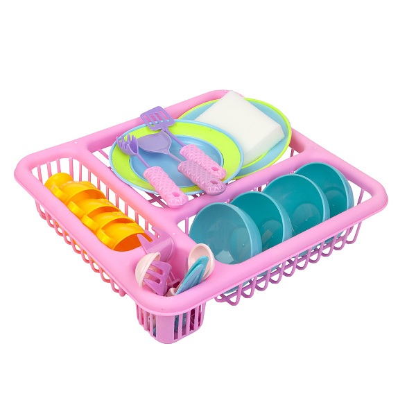В набор входит сушилка для посуды, два вида тарелок, чашки, столовые приборы и губка для мытья посуды. Имитация процесса мытья посуды ознакомит ребенка не только с правилами гигиены и приготовления еды, но и разовьет в нем ответственность и аккуратность.