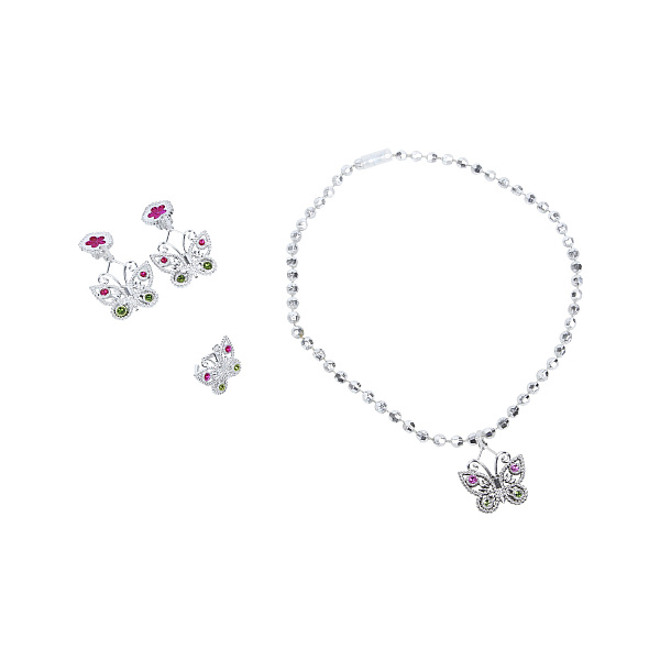Набор украшений для девочки, выполненных из серебристого пластика, включает ожерелье, серьги-клипсы и кольцо. Изделия украшены милыми бабочками, цветами и разноцветными бусинами, которые порадуют маленьких модниц.