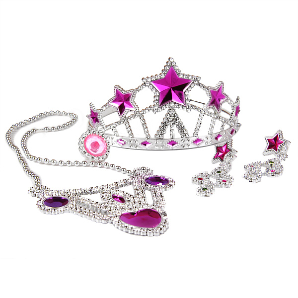В набор принцессы входит корона, ожерелье, серьги и колечко. Все аксессуары серебристого цвета, украшены ярко-розовыми блестящими камнями.